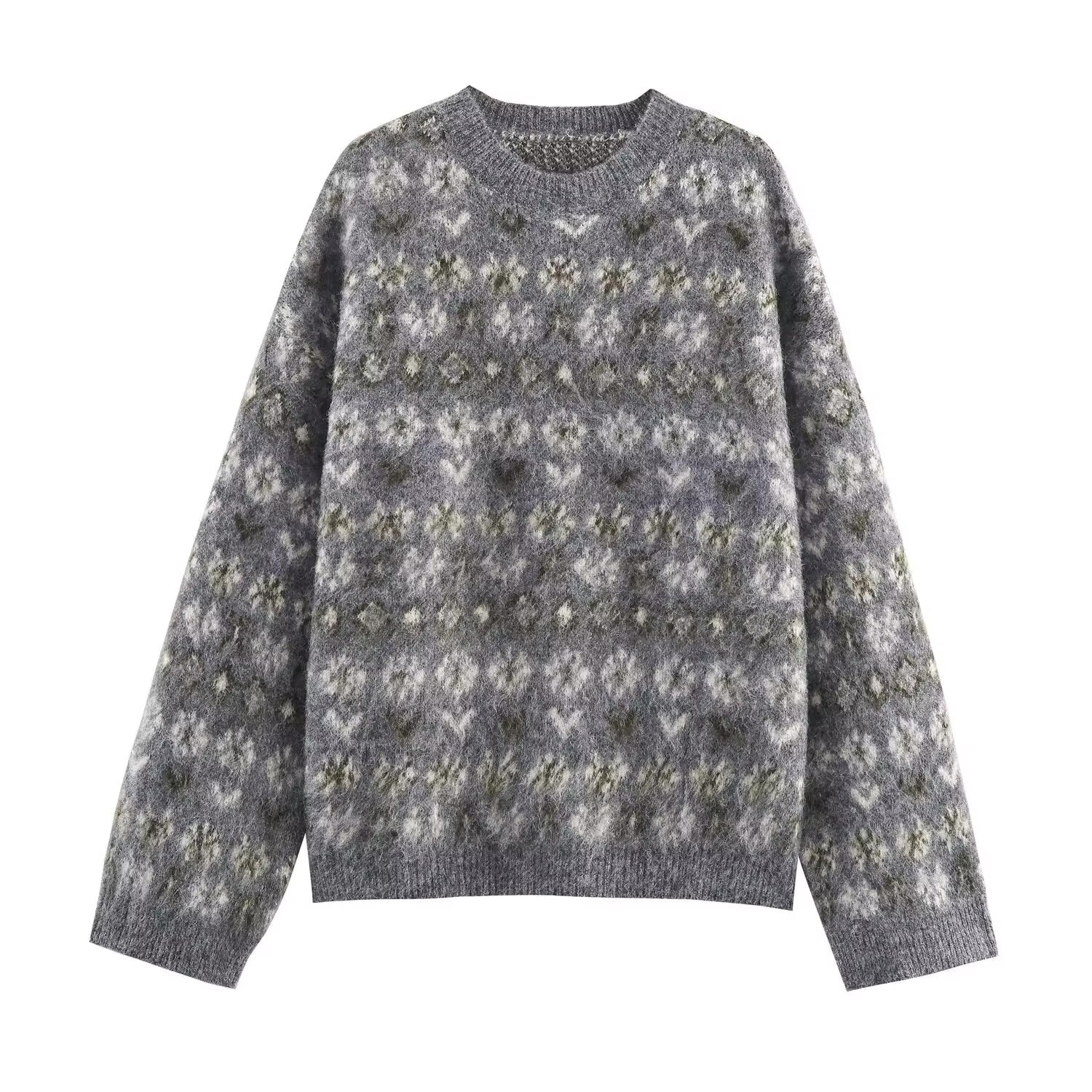 This knit sweater features a patterned surface with a consistent design across the body and sleeves. It is constructed with long sleeves, a crew neckline, and a regular-length cut. Ribbed edges are present at the neckline, cuffs, and hem. No additional decorative elements are applied beyond the pattern itself.